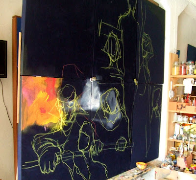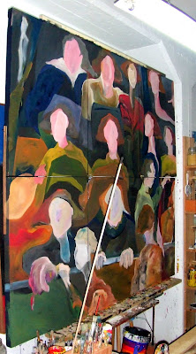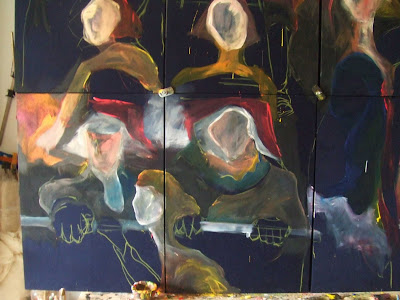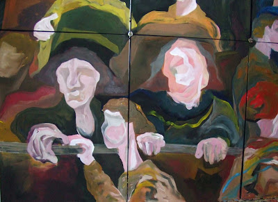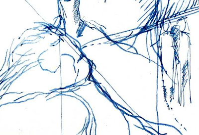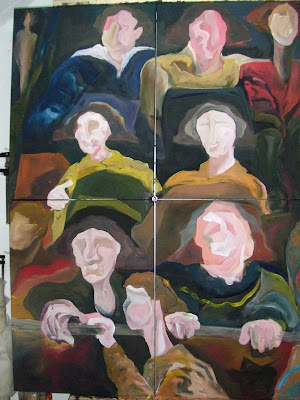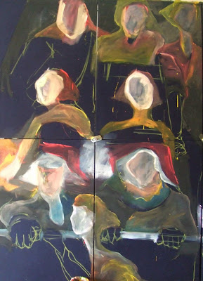 Decidí, teniendo en cuenta que siempre es lo más complicado saber cuando ya no avanzará más…:, terminó. A otra historia (hoy inicio un nuevo del que en próximos días daré cuenta). Son seres que vuelven entre pensativos y coloquiales de la sesión de baile en la residencia de ancianos (Porta del Camino). Protagonistas en un escenario trasero de un autobús que se convierte en palco teatral - operístico de una representación en la que ellos/as son los actores y el palco también escenario. Donde la gente va de pie y se agarra de una asa superior inexistente, una diva que se estira en un escorzo de baile, danzante por un pasillo invisible.Vestimentas de otras épocas (actores y actrices ambientados en un pasado remoto del que proceden en su vida de tesoro de recuerdos).Hay un personaje fuera del palco, dudé si acompañarlo de más gente en una acera compostelana, que finalmente quedó sólo y fuera de la “danza”. Pero muy presente y simbolízante de un exterior que se incorpora… Alguna cara que intenta hacerse presente y que el ambiente no lo deja.